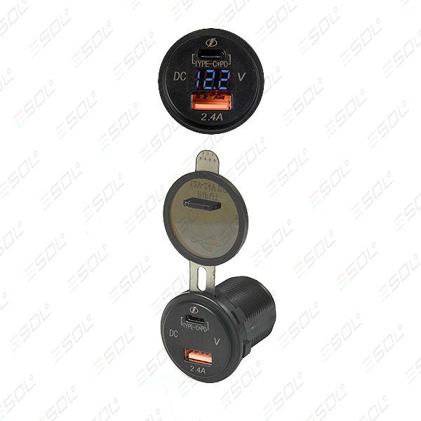zasilacz samochodowy z dwoma gniazdami: USB-C PD oraz USB-A 2.4A- dedykowane do szybkiego ładowania urządzeń. Dzięki technologii Power Delivery (PD) z maksymalną mocą naładujesz laptopa, tablet lub smartfona. Wbudowany układ scalony rozpoznaje automatycznie podłączone urządzenie, co umożliwia wydajny i optymalny proces ładowania. Zasilacz do zastosowania w pojeździe, przyczepie kempingowej lub samochodzie ciężarowym. Napięcie wejściowe: 12V / 24V ; Napięcie i natężenie wyjściowe : 5V 3.1A; 7V 2.4A; 9V 2A; 12V 1.5A ; Materiał: PA66"; woltomierz z wyświetlaczem z podświetleniem w kolorze niebieskim